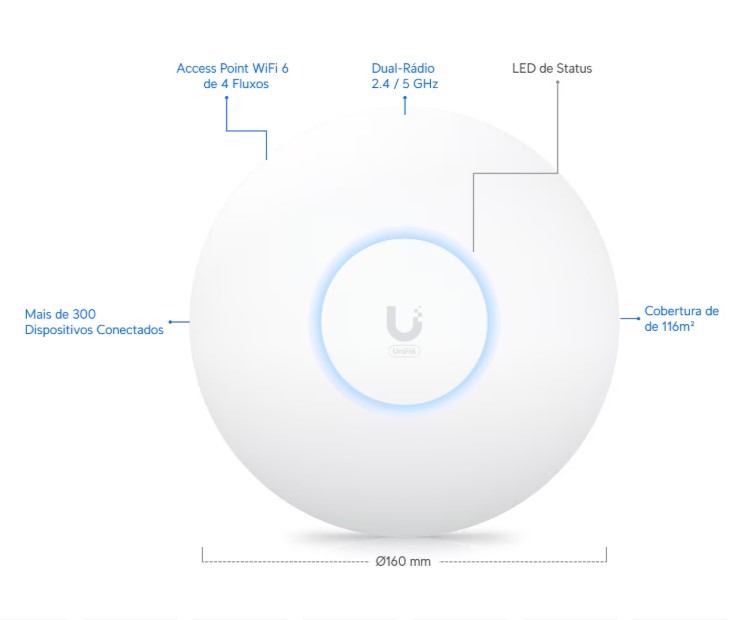 AP WiFi 6 com 4 fluxos espaciais que melhora o U6 Lite com maior desempenho e suporte a WiFi 6 de banda dupla. Ideal para pequenos e médios eventos